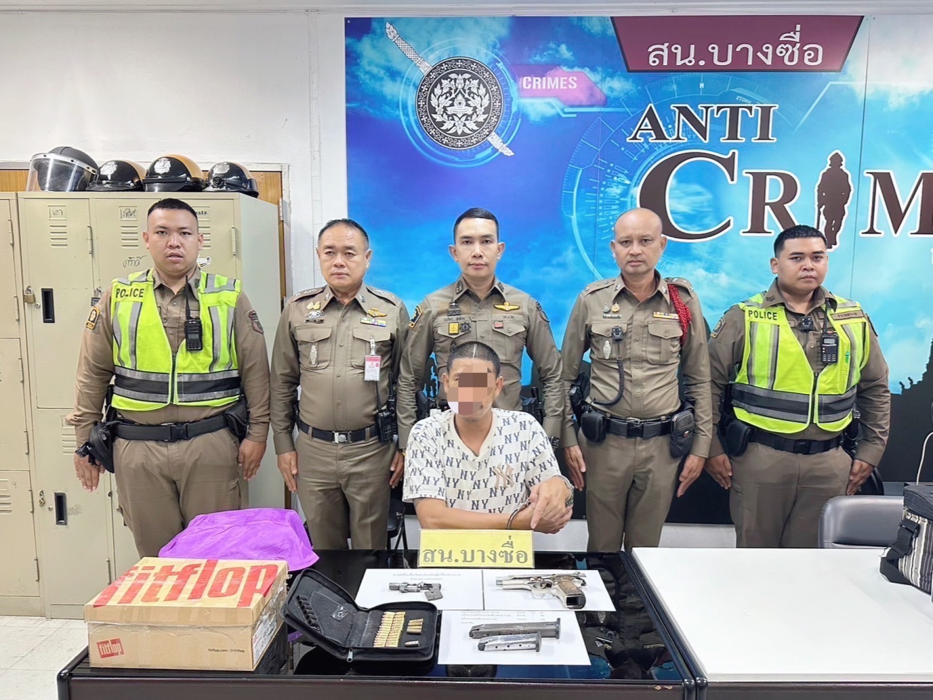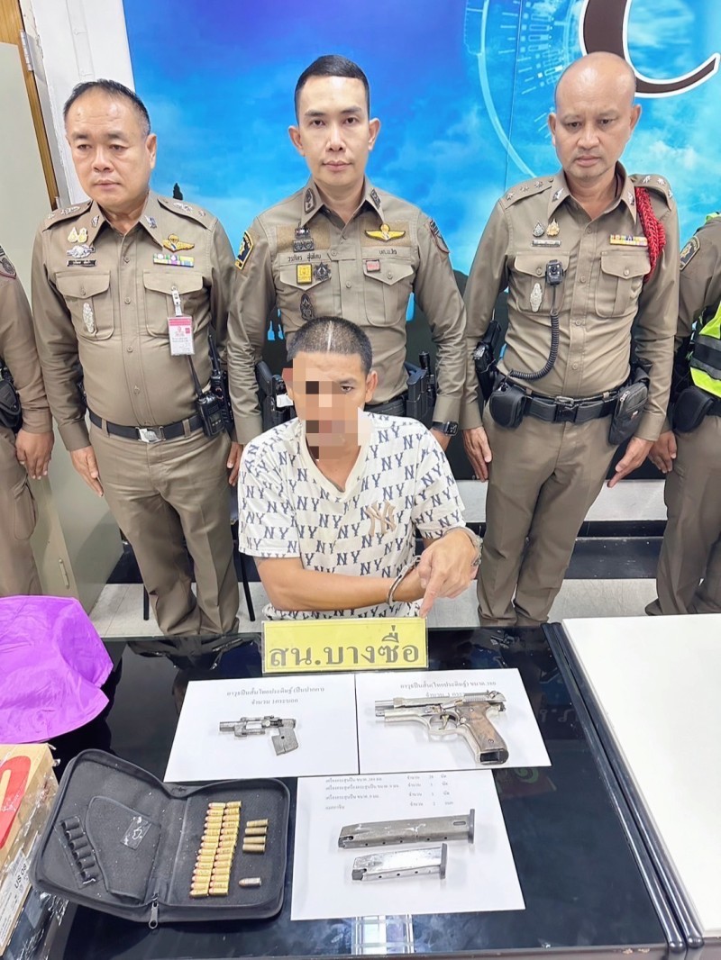 เมื่อเวลา 16.40 น.วันที่ 21 มิ.ย.พ.ต.อ.ภูวดล อุ่นโพธิ ผกก.สน.บางซื่อ สั่งการให้ พ.ต.ท.วรภัทร สุขไทย รอง ผกก.ป.สน.บางซื่อ พ.ต.ท.ชัยวัฒน์ พริ้งสกุล รอง.ผกก.สอบสวน.สน.บางซื่อ นำกำลังเข้าจับกุมตัวนาย ธีรยุทธ ฃอายุ 35 ปี ชาวจ.นครปฐม พร้อมของกลาง อาวุธปืนสั้น (ไทยประดิษฐ์) ขนาด.380 จำนวน 1 กระบอก, อาวุธปืนสั้นไทยประดิษฐ์ (ปืนปากกา) จำนวน 1 กระบอก, เครื่องกระสุนปืน ขนาด .380 มม. จำนวน 28 นัด, กระสุนปืน ขนาด .38 มม. จำนวน 4 นัด, กระสุนปืน ขนาด .9 มม.จำนวน 1 นัด และแม็กกาซีน จำนวน 2 อัน โดยจับกุมได้ที่บริเวณภายในสถานีขนส่งผู้โดยสารกรุงเทพฯ(จตุจักร) แขวงและเขตจตุจักร กรุงเทพ ฯ