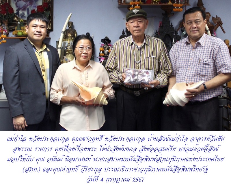 เจ้าแม่แห่งสังข์ แม่กำไล หวังประกอบกุล พร้อมด้วย บุตรชาย คุณโจ้ มหาสังข์ มอบสังข์เป่า และจี้สังข์มงคล แด่สมาคมหนังสือพิมพ์ส่วนภูมิภาค เมื่อวันที่ 5 กรกฎาคม 2567 โดยมีท่านอาจารย์ วันชัย สุพรรณ ร่วมมอบ ให้กับ คุณอนันต์ นิลมานนท์ นายกสมาคมหนังสือพิพม์ส่วนภูมิภาค