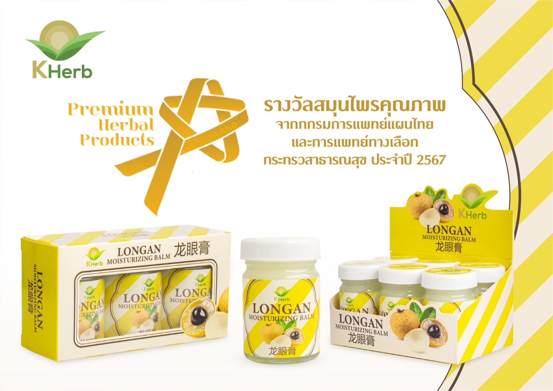 นายกวีวัธน์ เจริญโสพลวาณิช กรรมการผู้จัดการบริษัท เคพีซี 2021 จำกัด ผู้ผลิตครีมลำไย เคฮิร์บ ได้รับรางวัล สมุนไพรคุณภาพ จาก นายแพทย์ทวีศิลป์ วิษณุโยธิน อธิบดีกรมการแพทย์แผนไทยและการแพทย์ทางเลือก ในงานมหกรรมสมุนไพรแห่งชาติ ครั้งที่ 21 เมื่อวันที่ 6 กรกฎาคม 2567 ซึ่งนับเป็นการรับรางวัลสมุนไพรคุณภาพ เป็นปีที่ 2 ติดต่อกัน หลังจากที่ผลิตภัณฑ์ สเปรย์ฟ้าทะลายโจร เคเฮิร์บ ได้รับรางวัลสมุนไพรในปีที่ผ่านมาในเวทีเดียวกันนี้